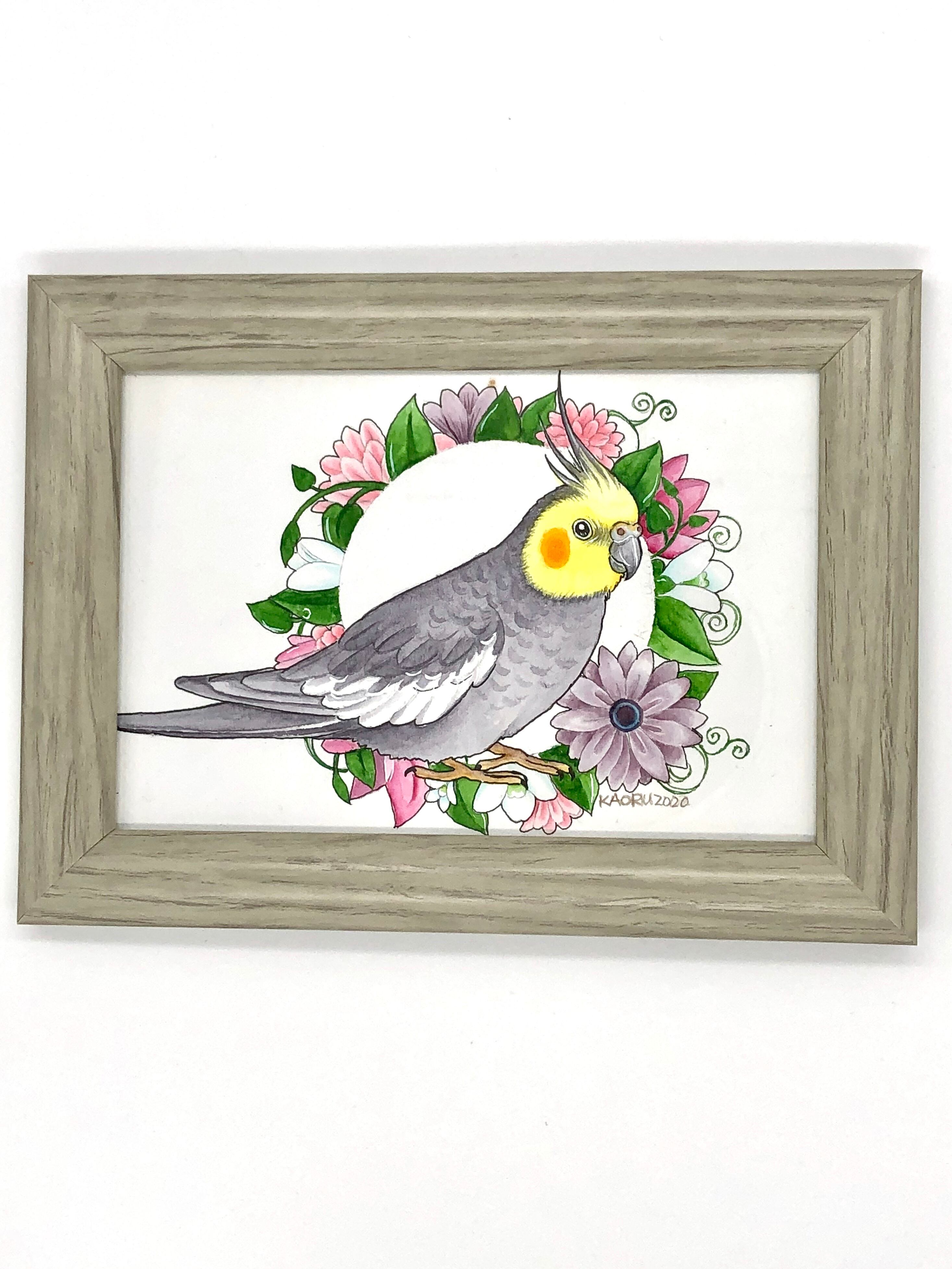 イラスト原画(オカメインコホワイトフェイス)額付き